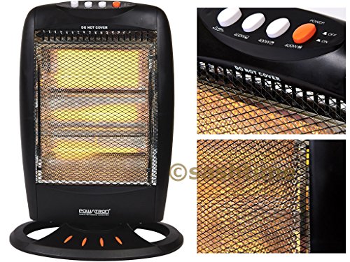 PRODUCT DESCRIPTIONS:Description: These high quality 3 bar 1200watt halogen heaters with oscillating feature are great for around the home, office, caravan, trailer etc. It is light and portable and gives great heat using less electricity than more conventional heaters. Most of all it is safer than other heaters. The halogen bars are protected by burn grill and do not heat up excessively as to cause a fire. Also there is a safety switch underneath the heater which automatically turns the heater of when tipped over. The 3 bars can be controlled individually so you can either put one or two or three bars on. You can also turn the oscillation feature on and off. When in oscillation mode the heater turns 180 degrees from left to right and right to left. The heater is made from a high quality heat resistant plastic that does not heat up. So you do not have to worry about being burnt by touching it. There is also a handle to carry or move the heater. Features : 3 Heat Settings: 400/800/1200w Energy Saving Safety Tip Over Switch Oscillating Function 3 Halogen Tubes **** This item can come in black or Grey we can not guarantee what colour you will receive ****