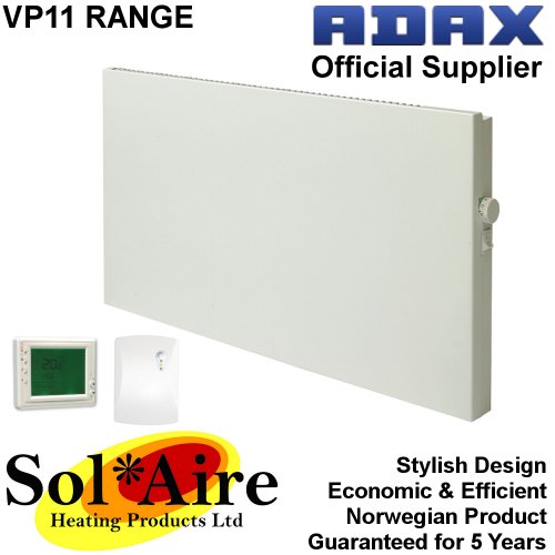 PRODUCT DESCRIPTIONS:ADAX - smart technology with a modern design. VP11 - compact economy model, easy and efficient, when you require one or more heaters. Safeguarded against overheating. With an on/off switch, a mechanical thermostat and 24hr timer. Easy to install with a detachable wall bracket. Connection by plug and lead or fixed installation. Doesn't burn dust and oxygen. Manufacturer ADAX. Model VP1107T/TIM. Power: 750 W. Measurements (height x length x depth): 420 x 430 x 84 mm. Voltage: 230 V. Temperature range of thermostat 6 - 30°C. Surface temperature: max. 75° C. Weight: 3,7 kg. Safety cut-out Installed. Minimum distance from top: 120 mm. Minimum distance from floor: 50 mm. 5 year guarantee. Supplied with the Solaire Wireless Controller & Receiver. The wireless control unit can be situated in any room within 60 metres of the heater without the need for wiring between the two units. The wireless control unit is large, easy to read and understand, with a LCD display showing day, time, actual temperature, set temperature and program mode. There is 5 day (weekday) and 1 day + 1 day (Sat/Sun) programming with four separate time/temperature periods per day.