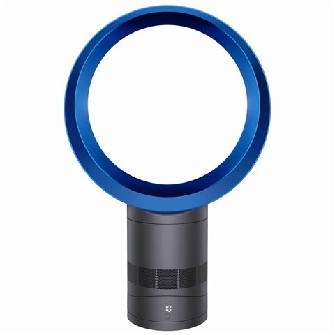 PRODUCT DESCRIPTIONS:DYSON DESK FAN IRON/BLUE * Air MultiplierTM technology - air is accelerated through an annular aperture drawing in surrounding air to project smooth powerful high-velocity airflow * Safe - no fast-spinning blades * Acoustic engineering - streamlined air channels for reduced airflow turbulence make AM06 75% quieter than AM01. Awarded the Quiet Mark by the Noise Abatement Society. * Energy efficient - engineered to create powerful airflow using 30% less energy than AM01. * Sleep timer - AM06 can be programmed to turn off after preset intervals ranging from 15 minutes to 9 hours. * Remote control - 10 precise airflow settings. Curved and magnetised to store neatly on the machine. * Oscillation control - to project air around the room. One touch for smoother oscillation. * Touch-tilt - pivots on its own centre of gravity staying put without clamping. * Easy to clean - no awkward grilles or blades. * 2 year parts and labour guarantee * Powerful air projection with No blades!Introducing The Dyson CoolTM AM06 Desk Fan that generates smooth constant airflow with the help of Dysons Air MultiplierTM technology that draws in surrounding air creating powerful air projection giving you superb airflow for personal cooling.The AM06 is quiet and powerful - 75% quieter than Dyson's previous generation of fans and Dyson engineers have reduced turbulence and noise throughout the machine by channelling airflow more efficiently.AM06 now houses a Helmholtz cavity designed to capture and dissipate noise from the motor - which has been calibrated to run slower whilst maintaining powerful airflow. An eccentrically aligned loop allows air to ensure with less turbulence further reducing noise.Precise cooling at your fingertips with the great remote control that features 10 precise airflow settings so you always stay at the optimum temperature!