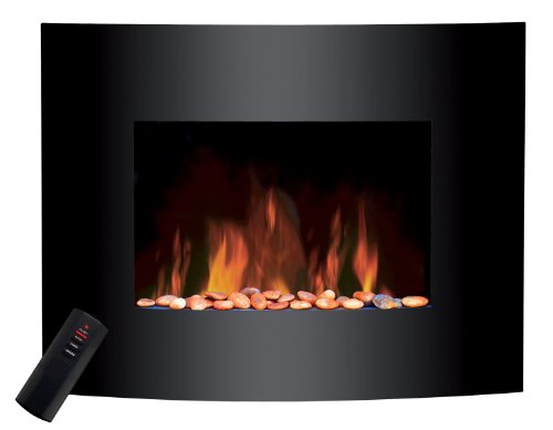 PRODUCT DESCRIPTIONS:This contemporary Electric Black Curved Glass Screen Wall Mounted Fireplace will look great in any house and will add a touch of class to your living room. Place this fireplace on the wall underneath your flatscreen TV or on its own against a wall, either way it will look great with its adjustable virtual flame and pebbles fuel effect. It also features a remote control allowing you to control the level of heat and the flame effect from the comfort of your armchair. The flame effect can be used independently so that you can enjoy the effect in the summer without having to turn the heat on. It has two heat settings, 1000W and 2000W and features overheat protection for added safety. It is a forced fan heater so it has a fast warm up time for instant heat. As it is electric it is simple to fit, there are no gas pipes required and it does not require a flue